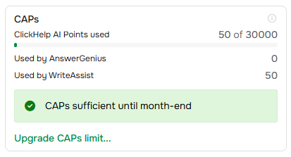 Also, WriteAssist has moved to the CAPs payment model as part of the AI Suite, joining AnswerGenius with shared credits. Monitor your usage for both WriteAssist and AnswerGenius on a single subscription page.